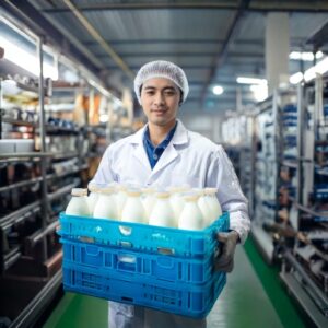 Firefly 牛乳瓶が詰まったケースを運ぶ工場の人…